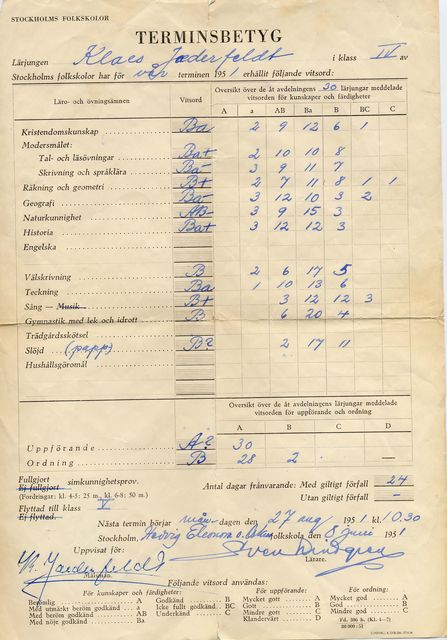 här hade farsan skrivit på baksidan att jag kunde simma, dessutom ser jag att jag försökt förfalska betyget med + i läsning, räkning & slöjd